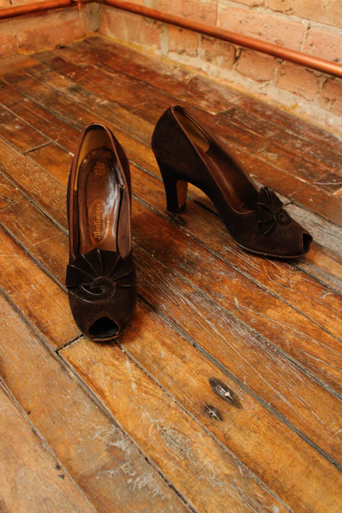 1930s Art Deco Brown Brushed Leather High Heels - 8N