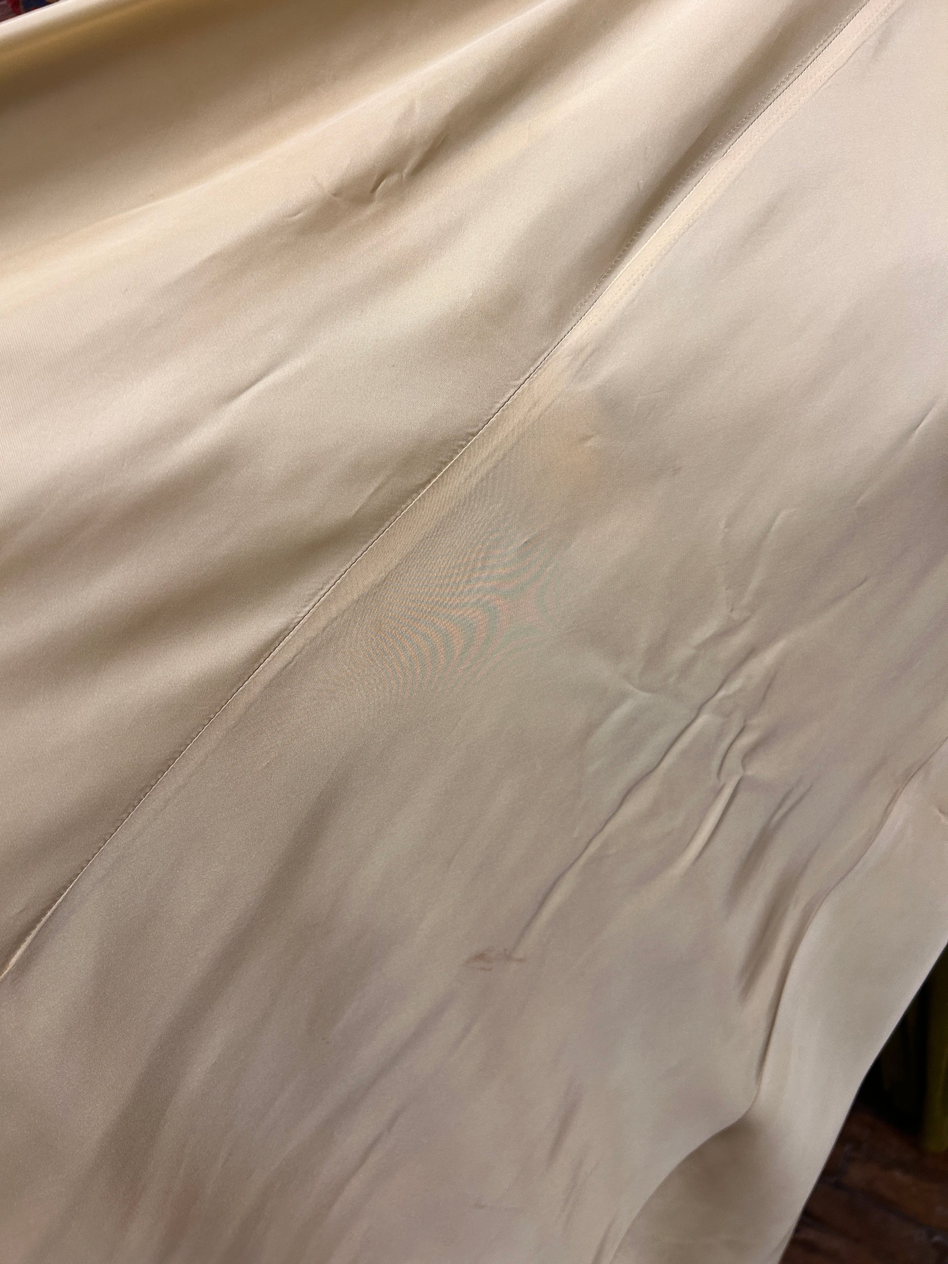 Condition: Good with two things to note. Repair on top shoulder on jacket, and couple faint lighter color gradient on skirt, not noticeable at all. Cleaned and ready to wear.