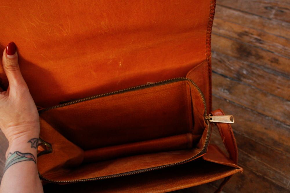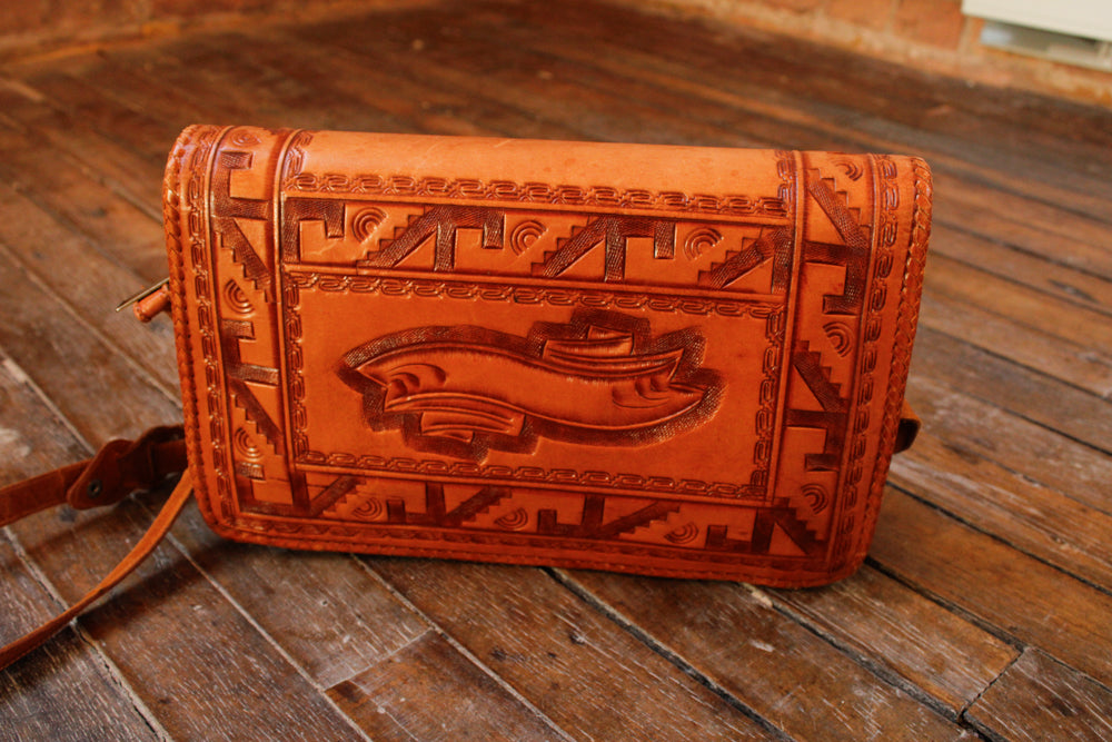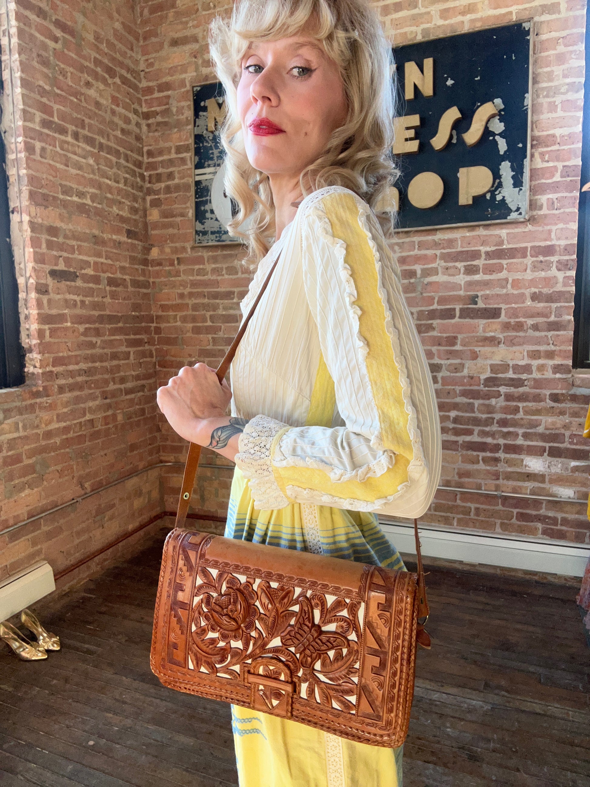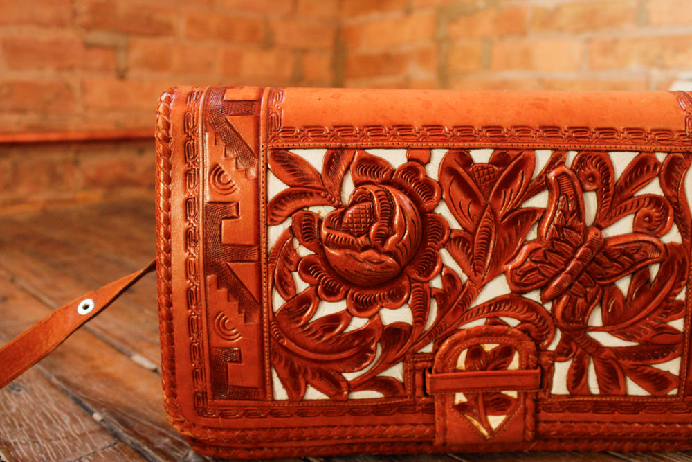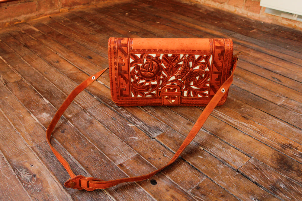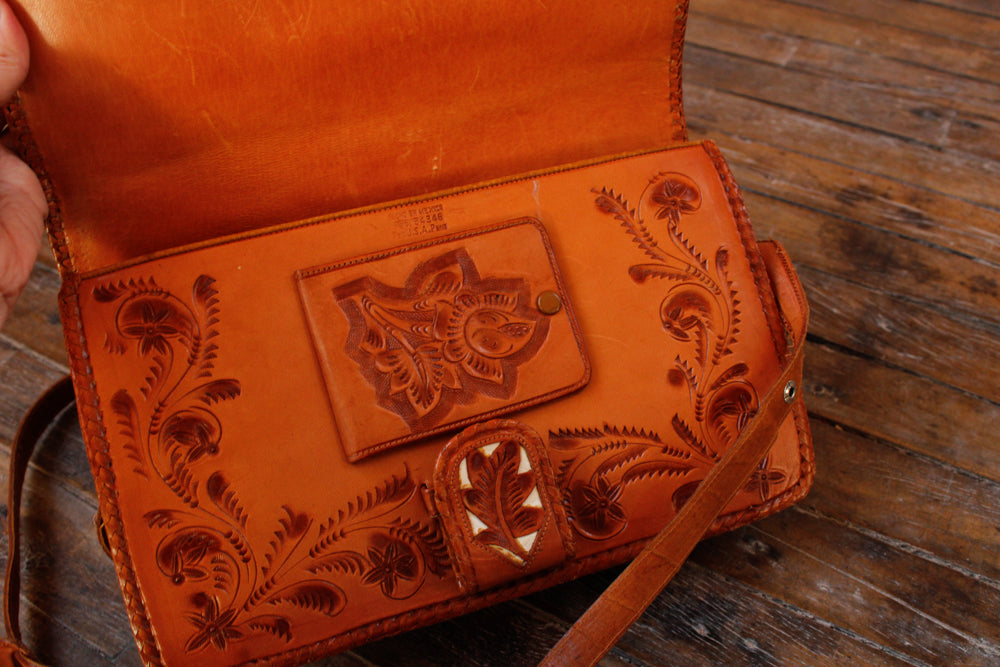 This vintage 1940s Mexican floral and butterfly tooled leather purse is a rare find. The tan and white leather floral pattern, perfect addition to your outfit. With multiple Zippered compartments and a built-in wallet, it's perfect for carrying all your essentials. The long strap allows for hands-free convenience.