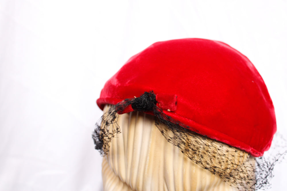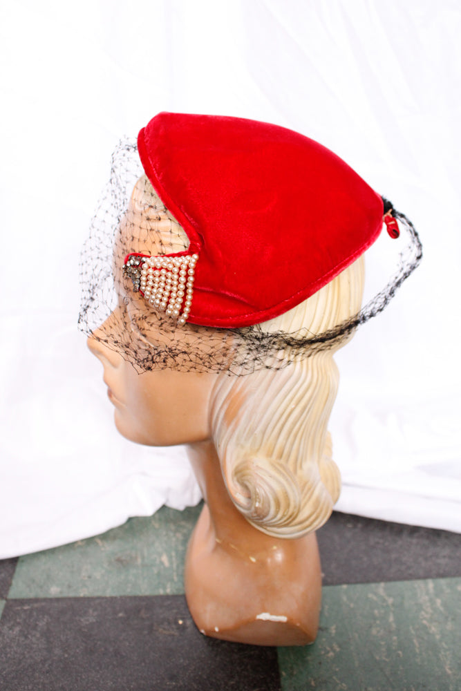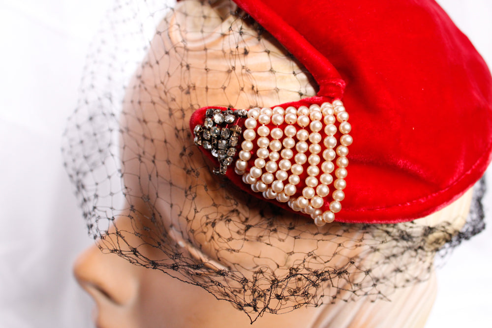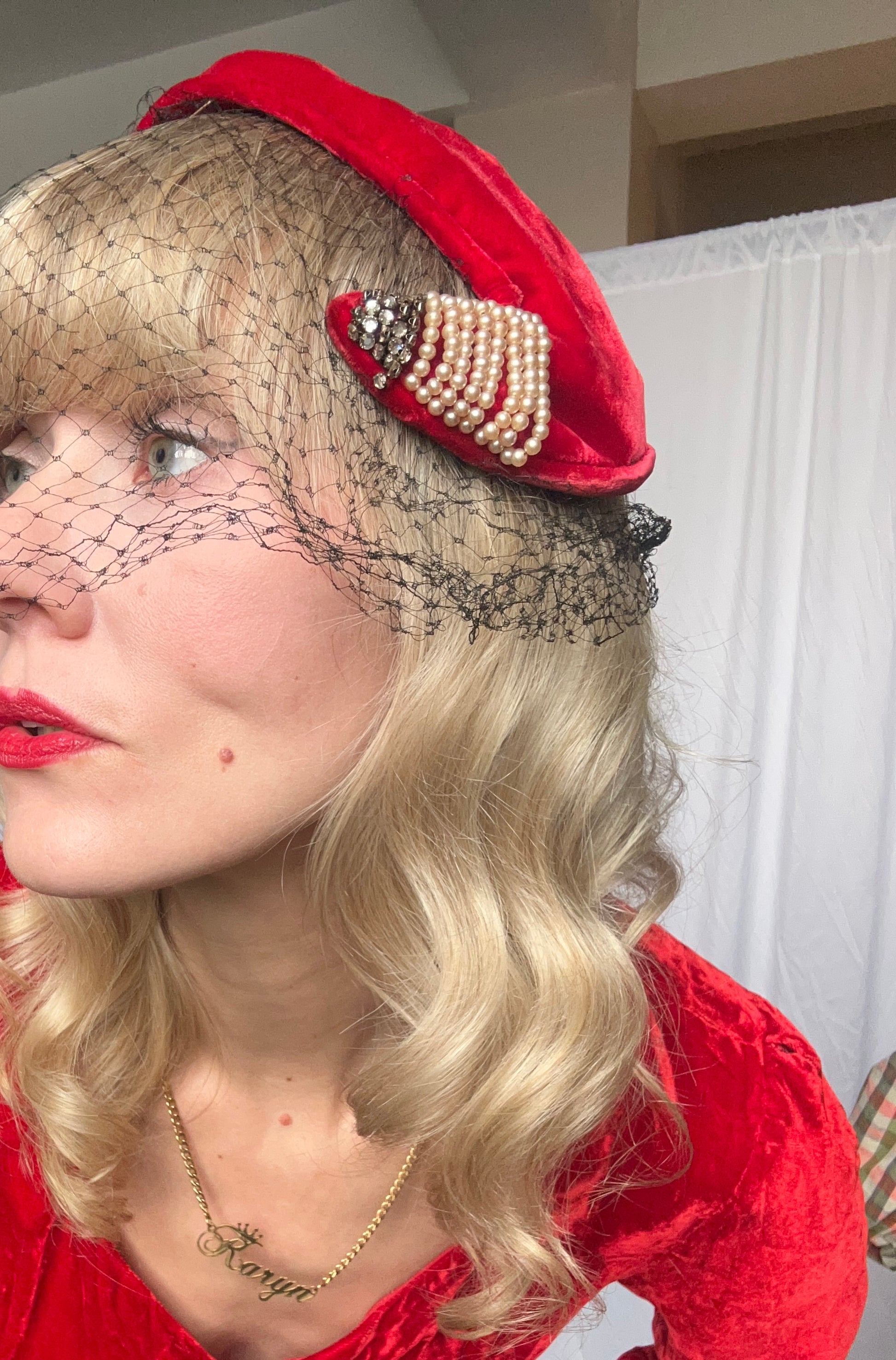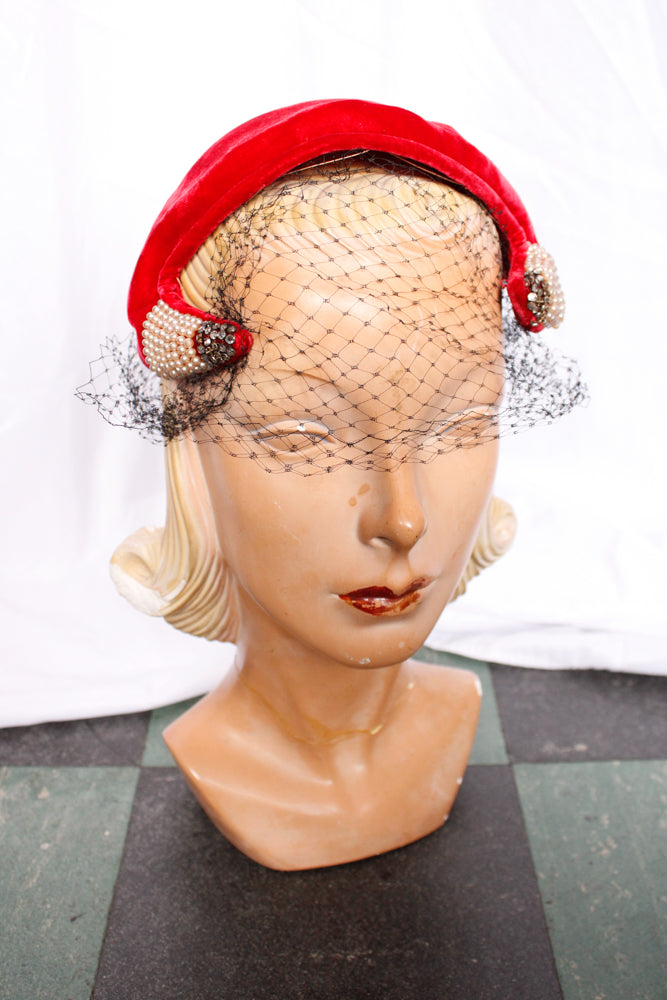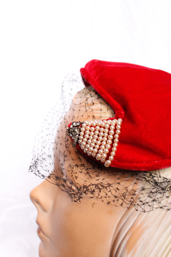 Material: Rayon velvet. faux pearl and rhinestone, netting veil