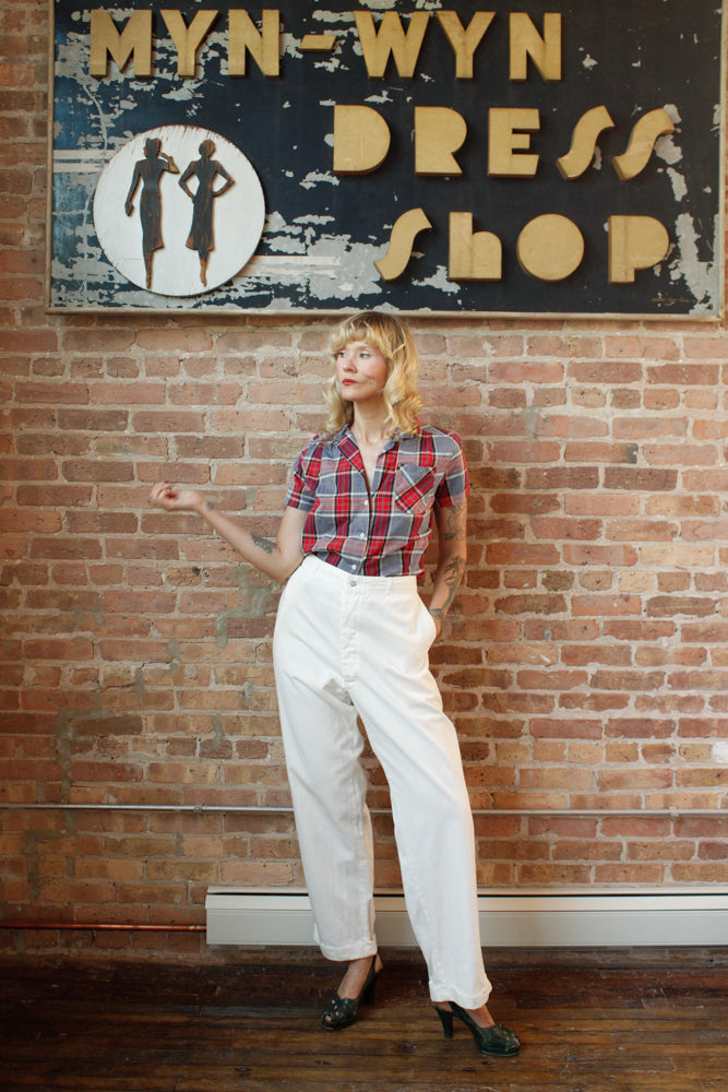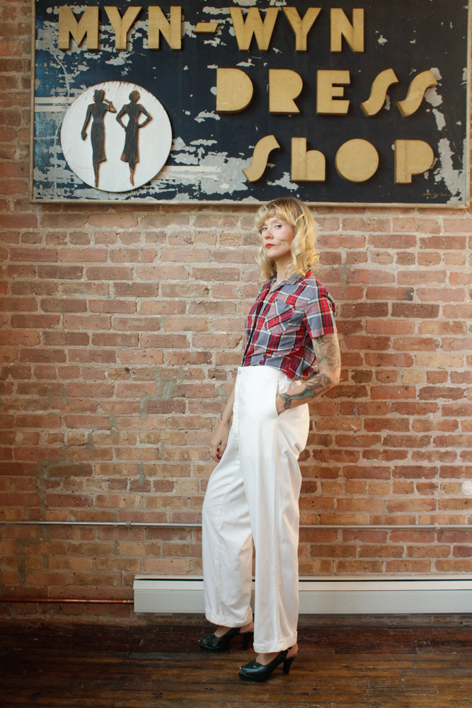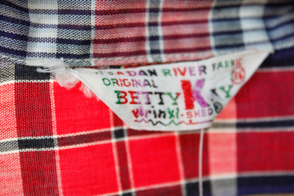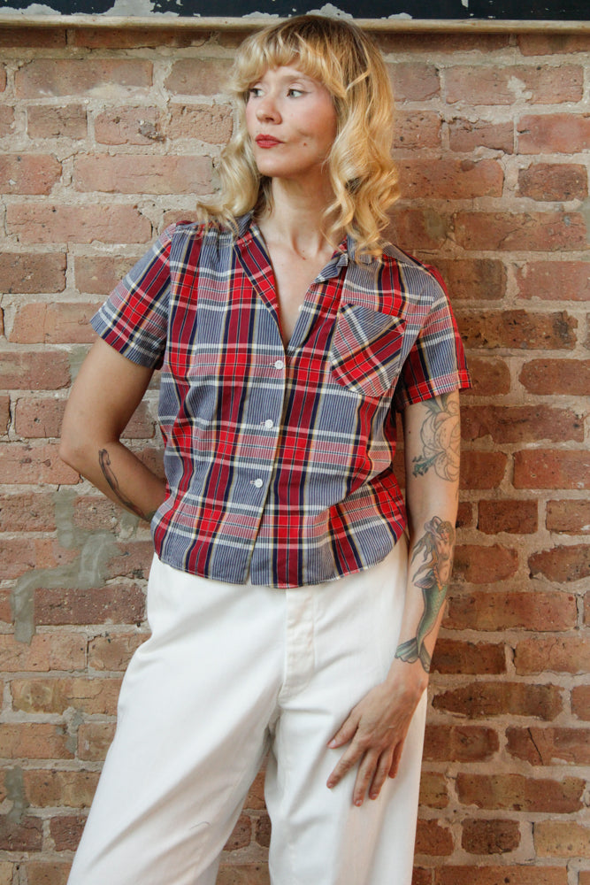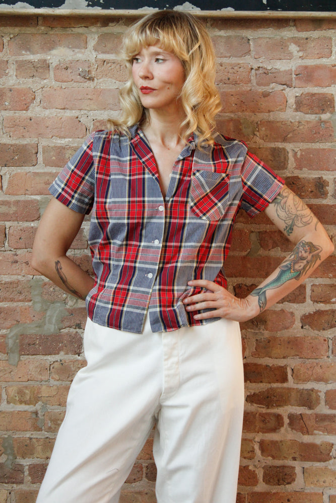 1950s Blue & Red Plaid Cotton Shirt - Medium