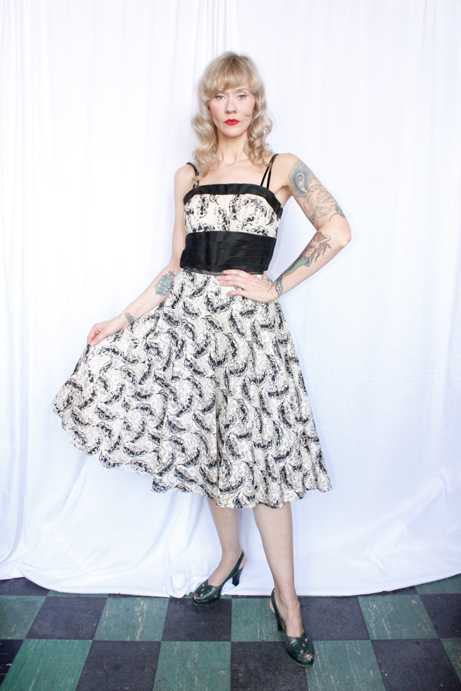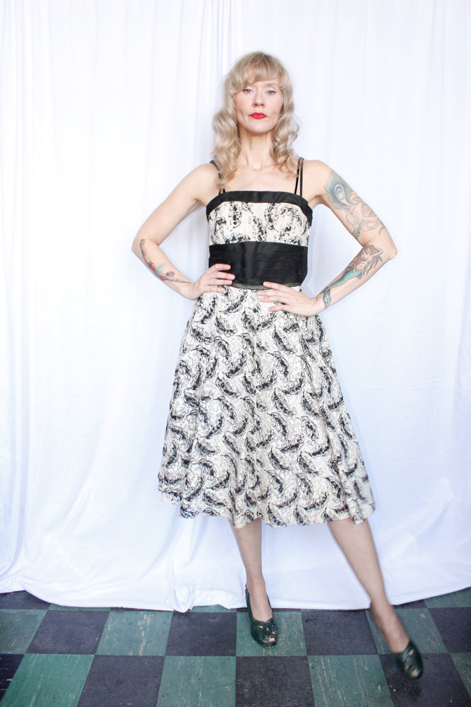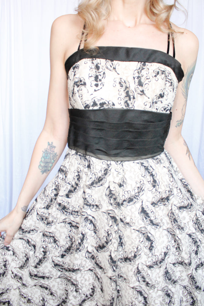 1950s stunning cocktail dress! With a unique feather pattern lace overlay on organza. Black and white, a metal zipper, and a fitted bodice and full skirt. You'll be the center of attention in this amazing piece of history.