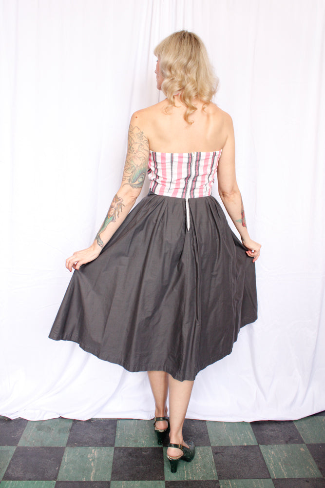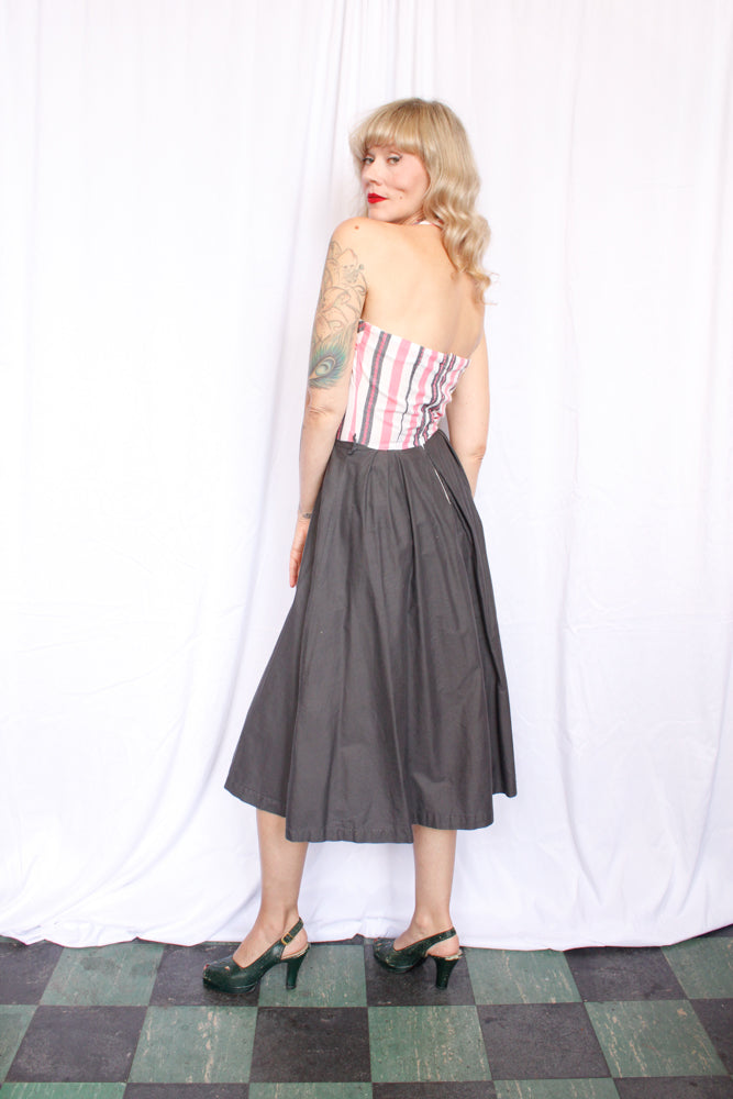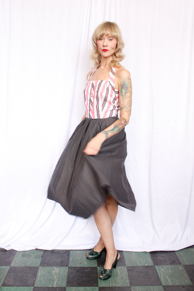 1950s adorable handmade cotton halter dress. Back metal zipper, hook eye halter neck. White, Pink stripe bodice with floral detail, solid grey full skirt.