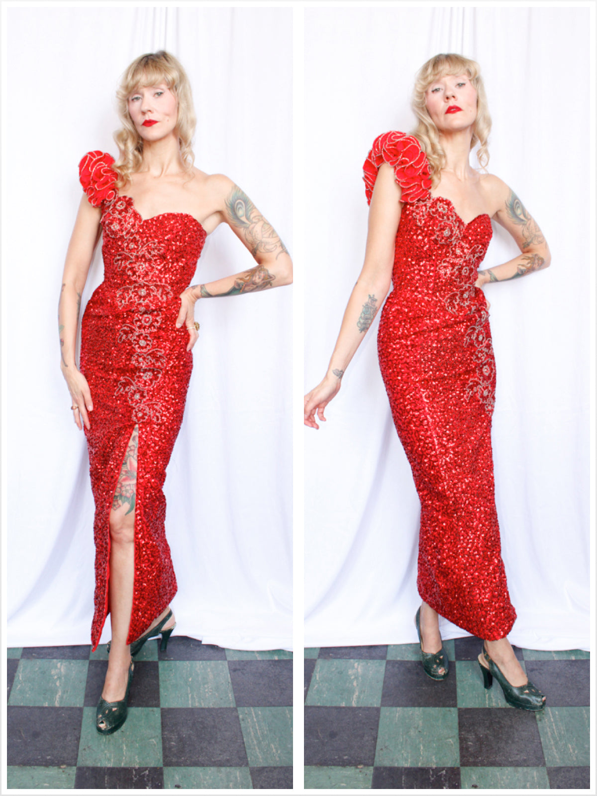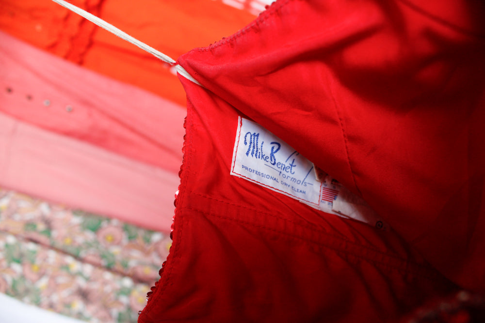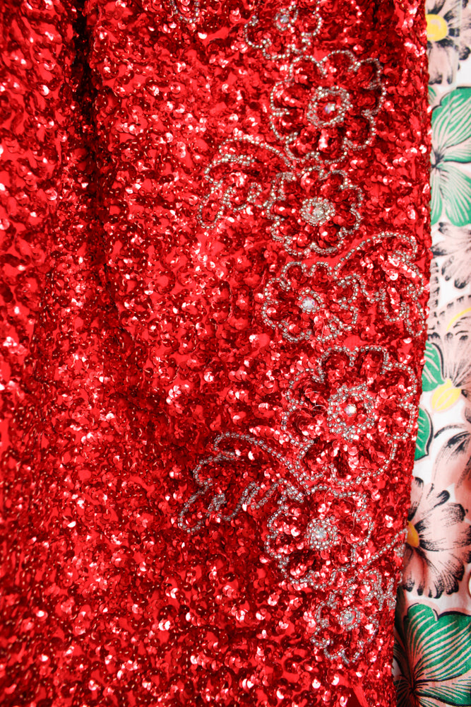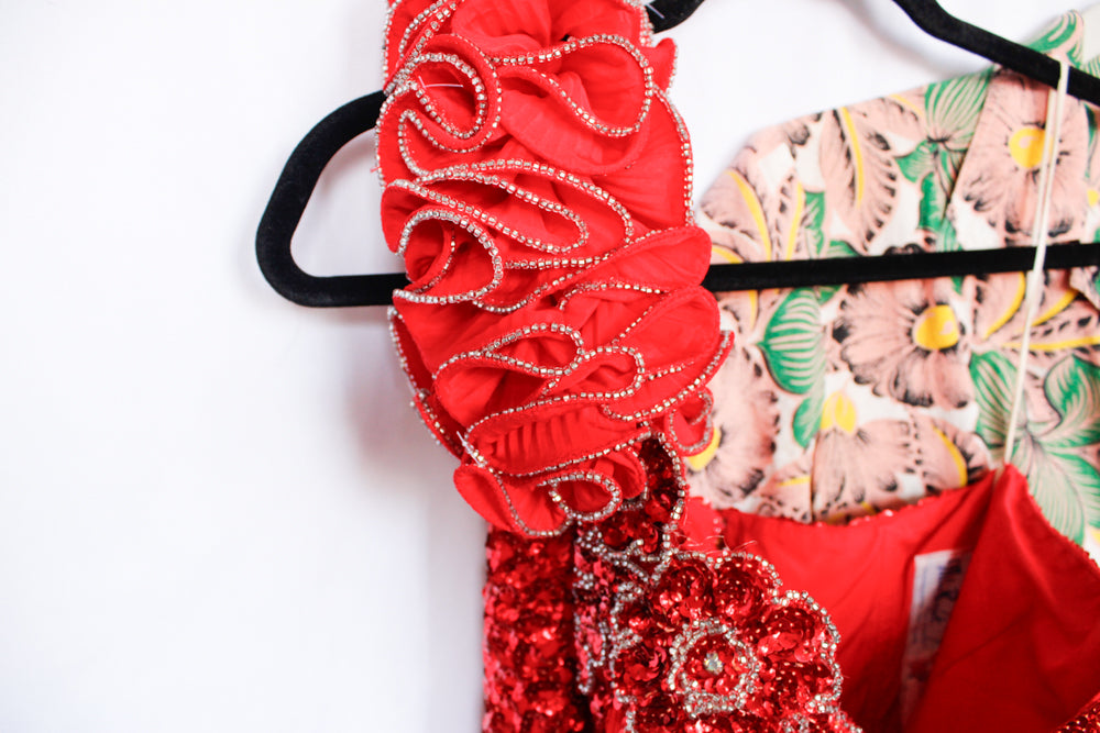 1980s Red Sequined One Shoulder Showgirl Gown - Xsmall