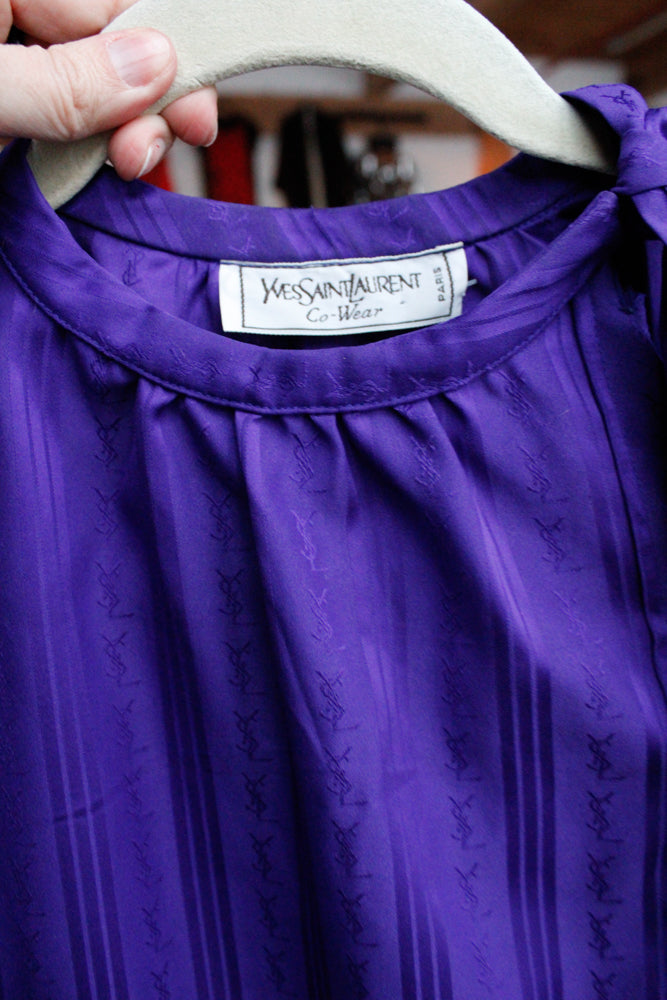 1980s YSL Embossed Logo Purple Blouse - S/M
