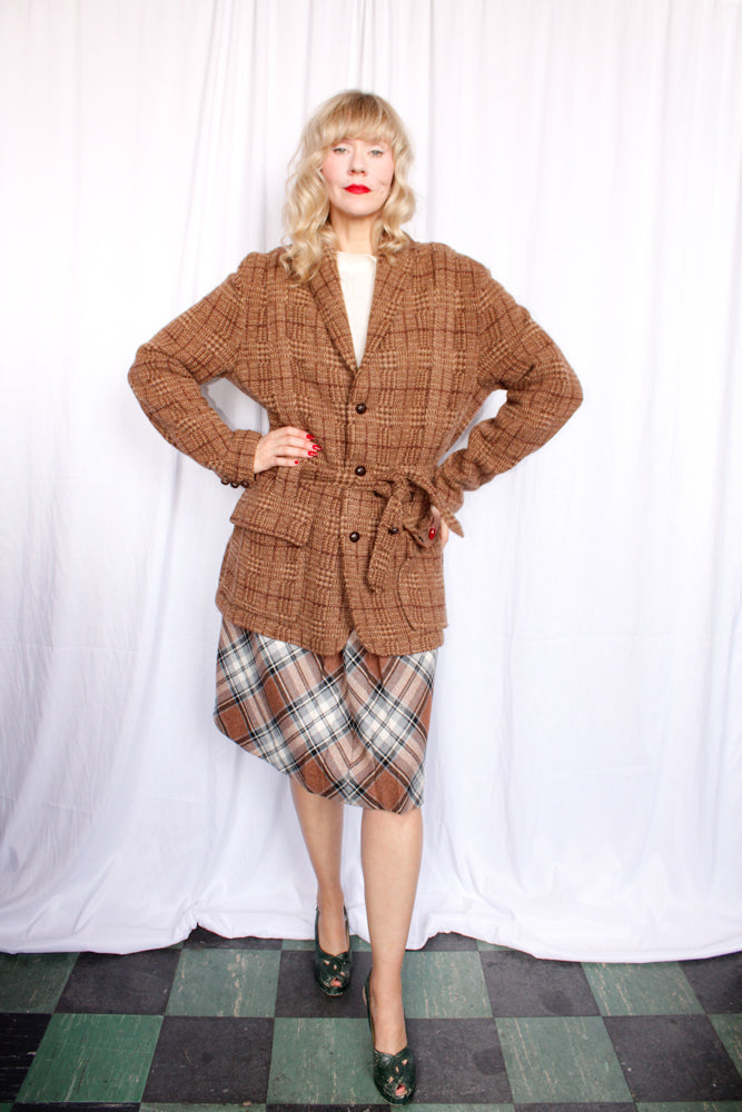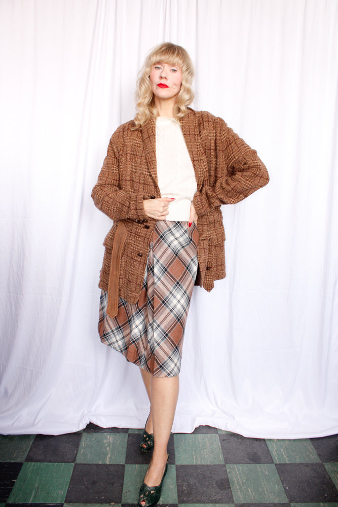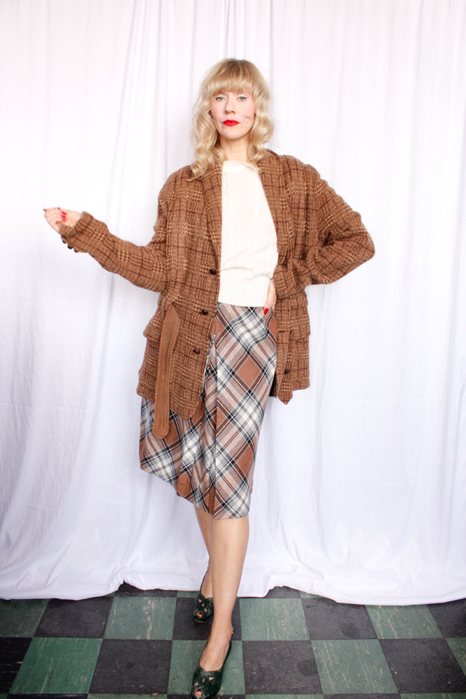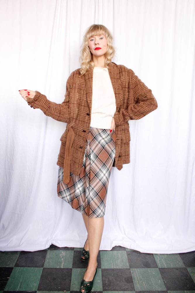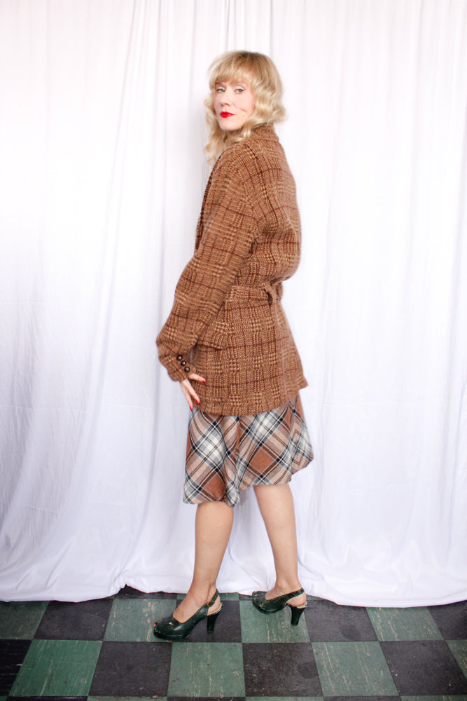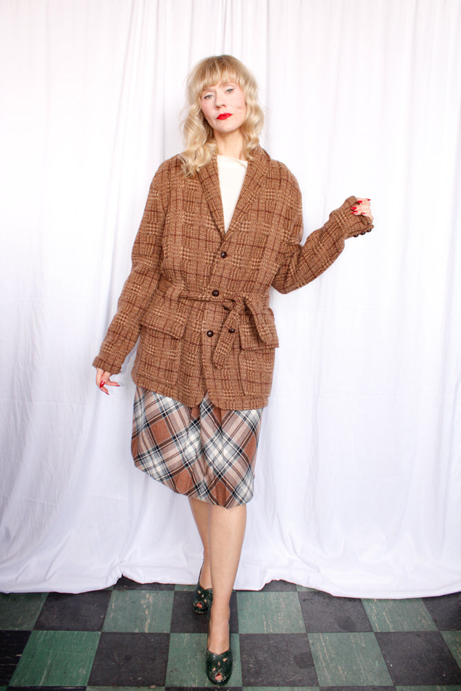 1990s Ralph Lauren Brown Plaid Wool 20s Style Belted Cardigan Sweater - XL