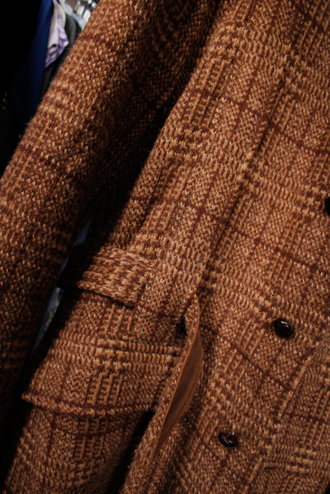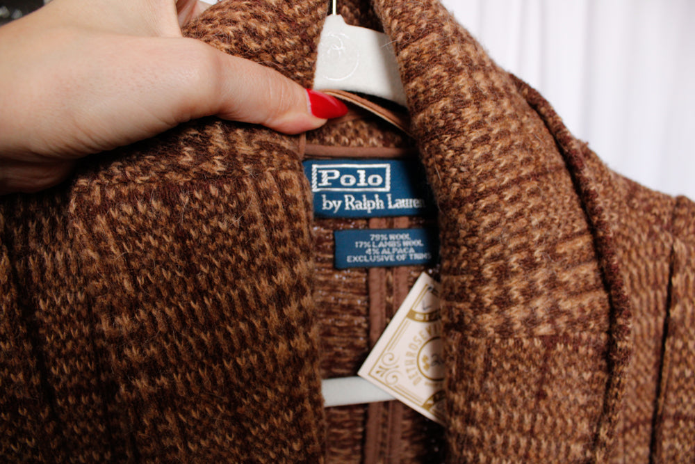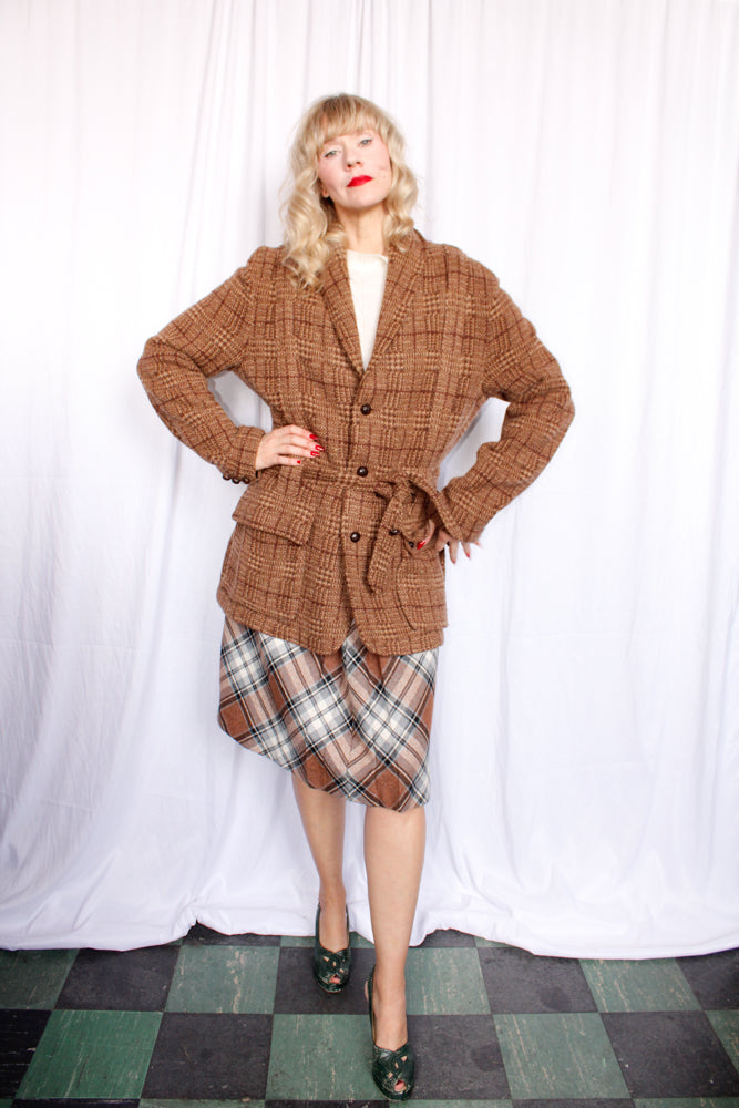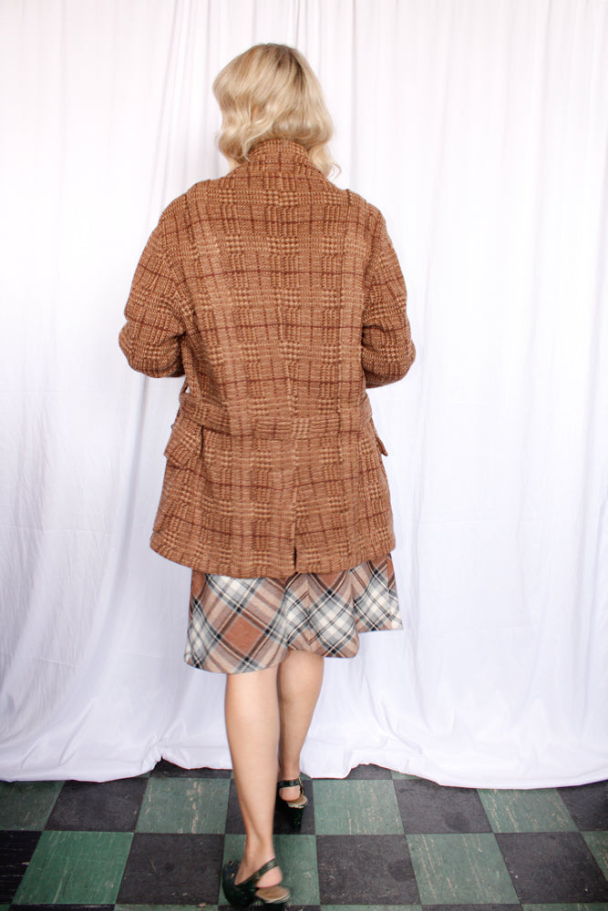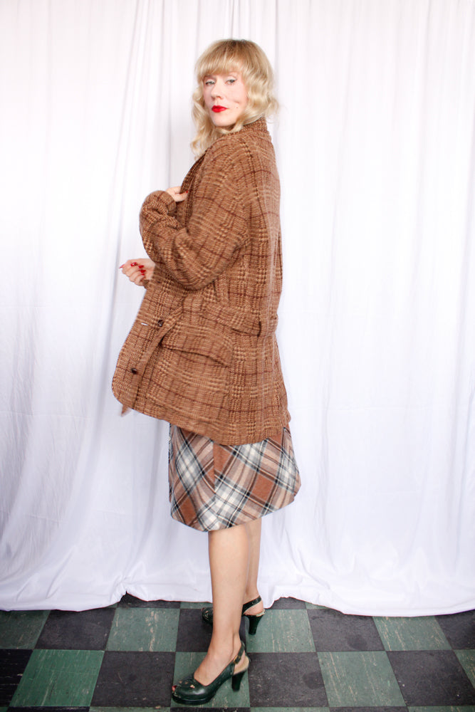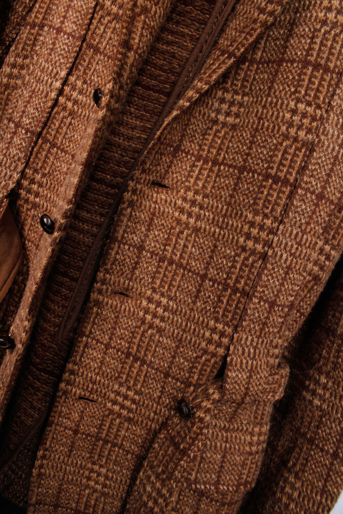 1990s Ralph Lauren Brown Plaid Wool 20s Style Belted Cardigan Sweater - XL