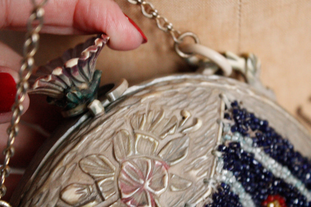 Early 1920s French Carved Celluloid Beaded Floral Handbag